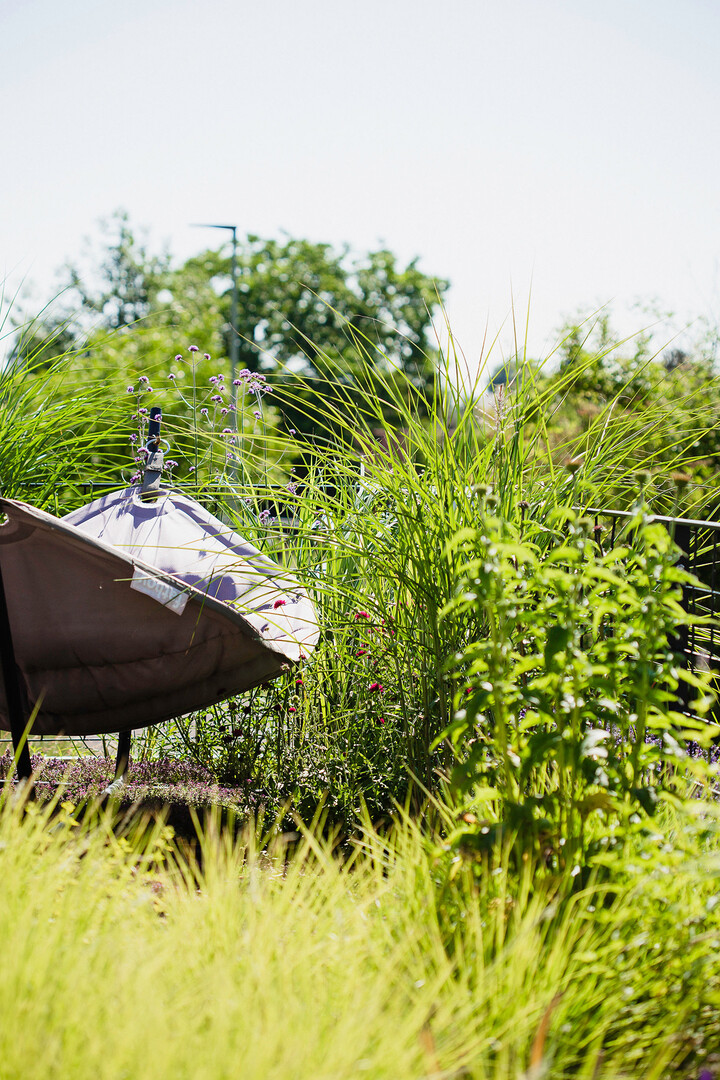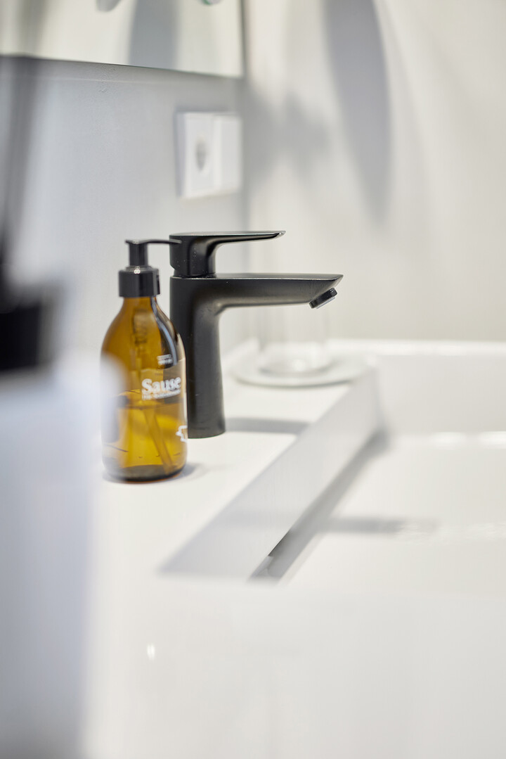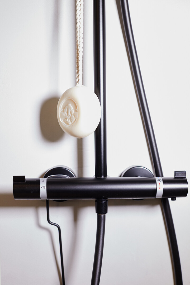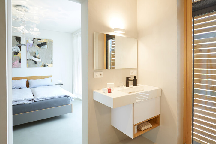 From the living area, bedroom and bathroom, you can access the garden with a large terrace and barbecue area. The wooden sliding elements in front of the floor-to-ceiling windows provide decorative shade. Outside, you can relax in the hammock and cool off in hot weather in the temperature-controlled outdoor shower. You can enjoy the castle view from your lounge chair in the garden while sipping a glass of wine or juice from the region.