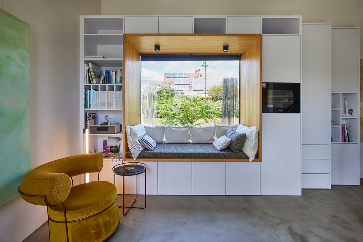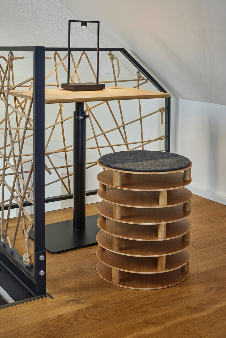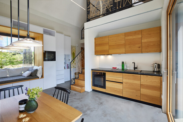The high-quality equipped kitchen invites you to cook and the seating window built into the shelf wall invites you to linger. Here you can read or chill, if necessary it also serves as an additional sleeping option. From the living area you can get upstairs to the gallery - with two more sleeping options. The bedroom on the first floor has a bathroom en suite - barrier-free and with infrared shower.